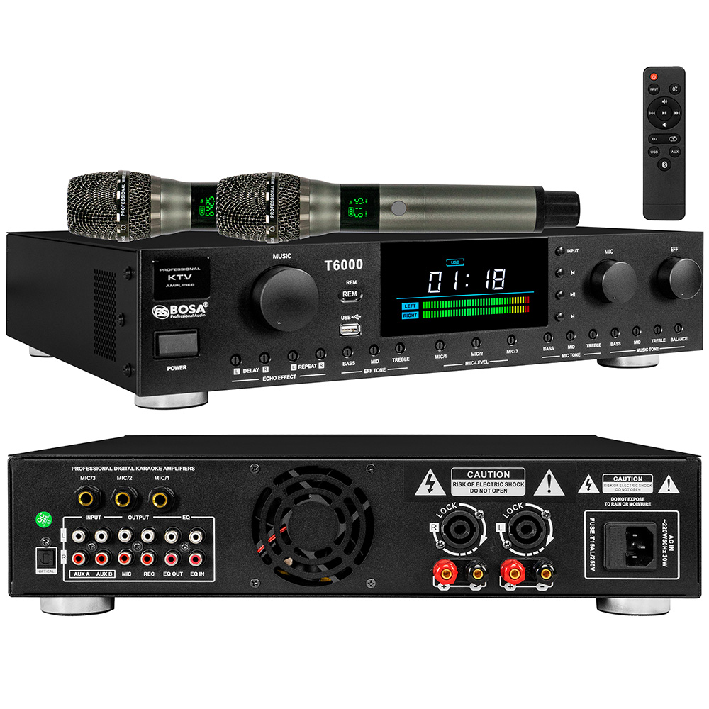 Amply karaoke 3 in 1 BOSA T6000 là mẫu amply karaoke được sử dụng cho các hệ thống âm thanh karaoke gia đình và các phòng hát kinh doanh quy mô vừa và nhỏ với những đặc điểm nổi bật bao gồm: thiết kế tinh tế, hiện đại phù hợp nhiều không gian khác nhau, công suất mạnh mẽ, tương thích với đa số mẫu loa trên thị trường, khả năng tạo hiệu ứng tiếng ngân vang đầy lôi cuốn, kết nối thông minh đa dạng, tích hợp vang 3 in1 sở hữu bộ vi xử lý âm thanh kỹ thuật số DSP thông minh với khả năng lọc âm thanh và chống hú rít cực tốt cho bạn thoải mái ca hát, nghe nhạc và xem phim với chất lượng âm thanh sống động như thật, điều chỉnh dễ dàng hứa hẹn sẽ mang lại những trải nghiệm âm thanh cực kỳ chất lượng cho mọi khách hàng.