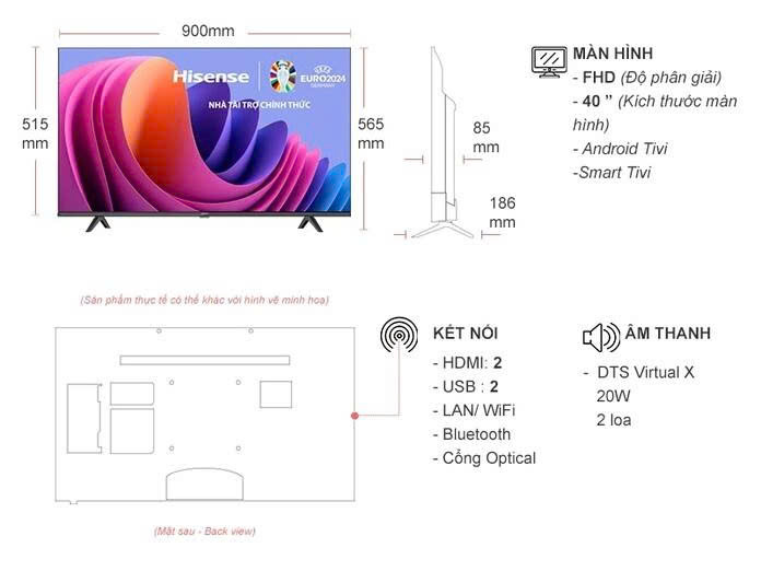 – Tivi HISENSE sở hữu màn hình rộng 40 inch với phần viền nhựa mỏng đầy tinh tế, mang lại hiệu ứng tràn viền đẹp mắt. Sản phẩm này hoàn toàn thích hợp với không gian nội thất của nhiều phòng khác nhau như phòng khách, phòng ngủ, phòng giải trí.