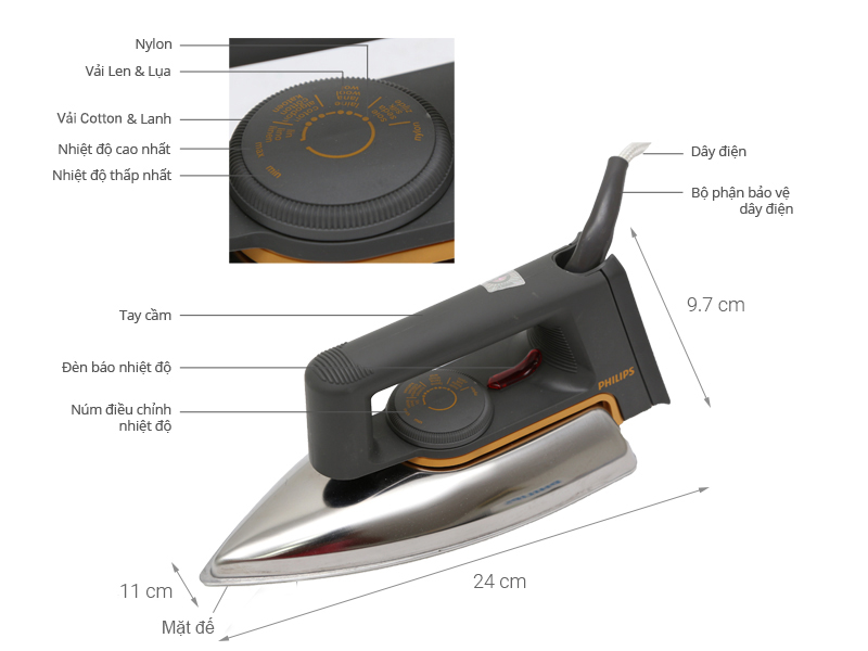 Nút xoay của bàn ủi khô giúp điều chỉnh nhiệt độ ủi thích hợp từng loại vải dễ dàng.