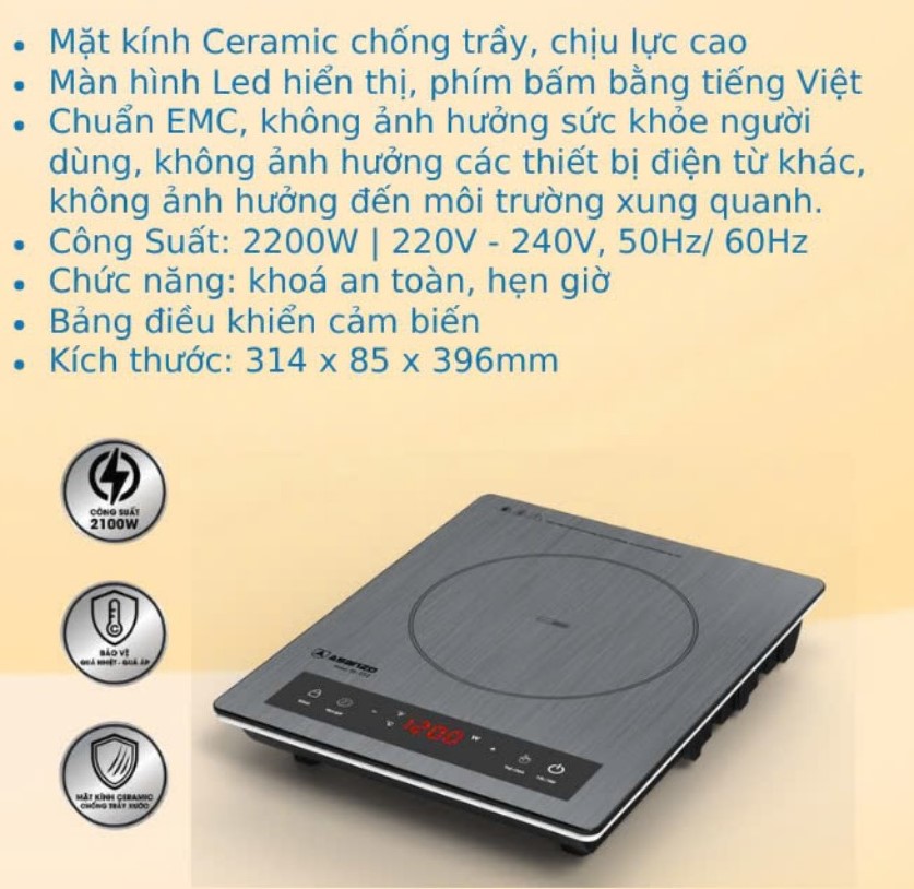- Công Suất: 2200W - 220V - 240V, 50Hz/ 60Hz.