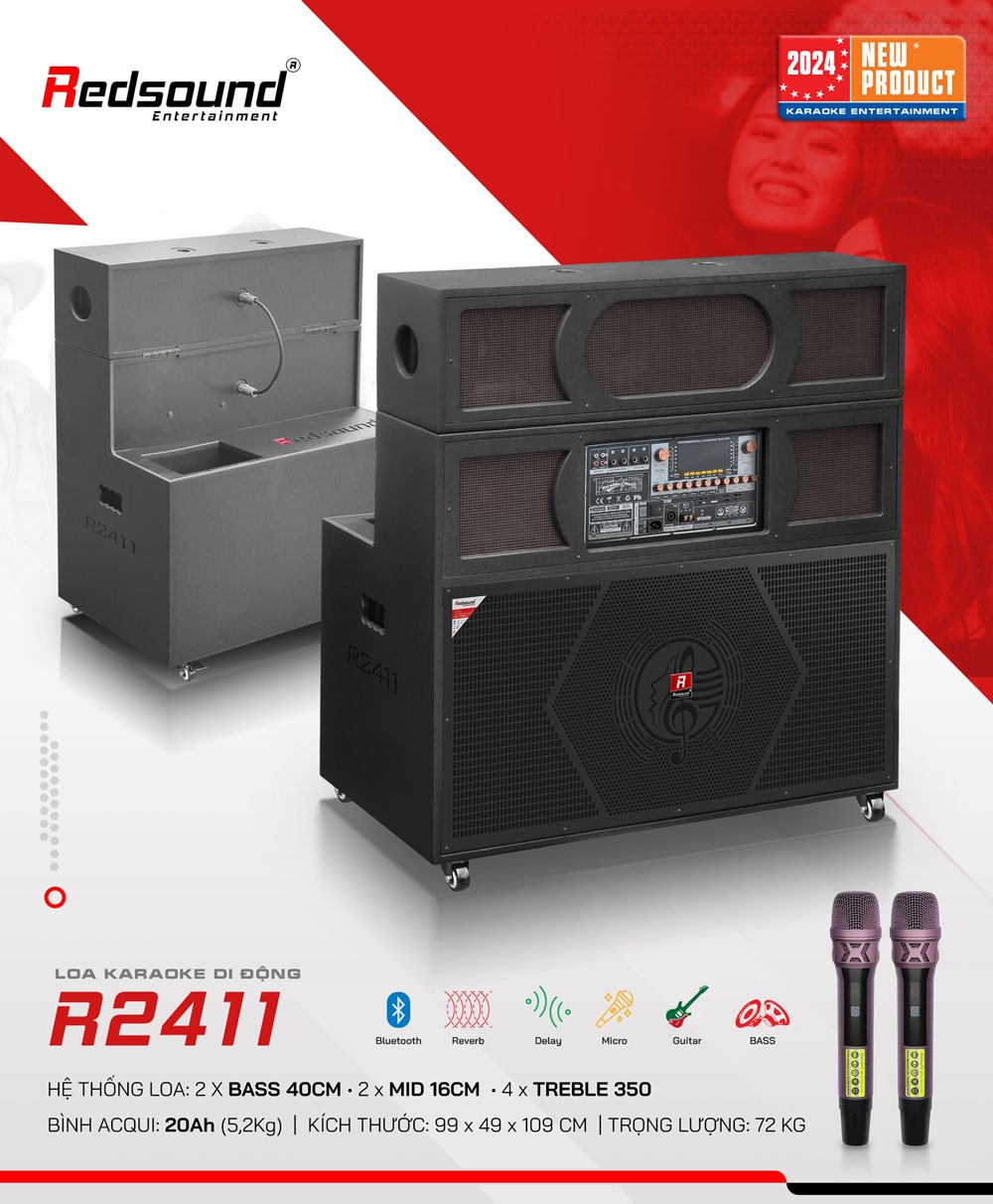 REDSOUND R2411 được trang bị hệ thống loa với 2 bass 40 cm, 2 mid 16 cm, và 4 treble 350, mang lại âm thanh chất lượng cao, mạnh mẽ và sắc nét. Công suất tối đa lên đến 850W đảm bảo khả năng phát nhạc và hát karaoke với âm lượng lớn, thích hợp cho các buổi tiệc tùng ngoài trời hoặc trong nhà.