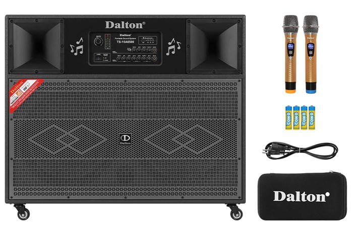 Loa kéo karaoke DALTON TS-15A6500 có khả năng di động, đi kèm 2 micro thuận tiện cho việc hát karaoke thoải mái cùng bạn bè. Ngoài ra loa còn có chất lượng âm thanh vô cùng mạnh mẽ, phù hợp với các không gian giải trí ngoài trời.