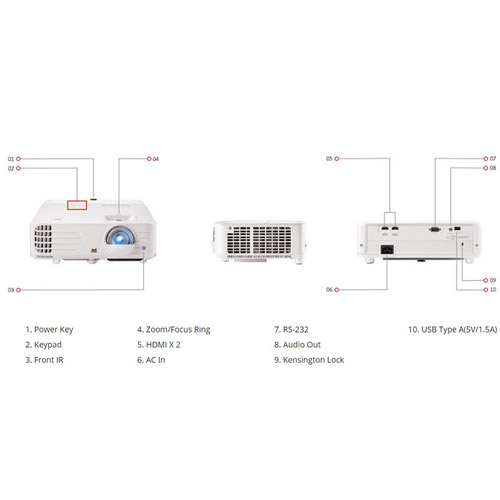 Máy chiếu có thiết kế đầy đủ các cổng cắm, đầu ra nguồn USB tích hợp (5V / 1.5A) trên Máy Chiếu VIEWSONIC PX701-4K, để cung cấp điện cho các thiết bị bảo vệ không dây HDMI, như Chromecast, Amazon Fire TV stick, v.v., loại bỏ nhu cầu về bộ điều hợp nguồn riêng khi phát trực tuyến nội dung đa phương tiện yêu thích của bạn.