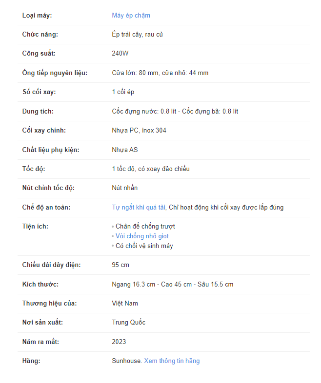 Máy ép chậm Sunhouse SHD5503 vận hành với công suất 240W, ống tiếp nguyên liệu lớn, được trang bị các tiện ích và tính năng an toàn đáp ứng nhu cầu sử dụng cơ bản trong gia đình.
