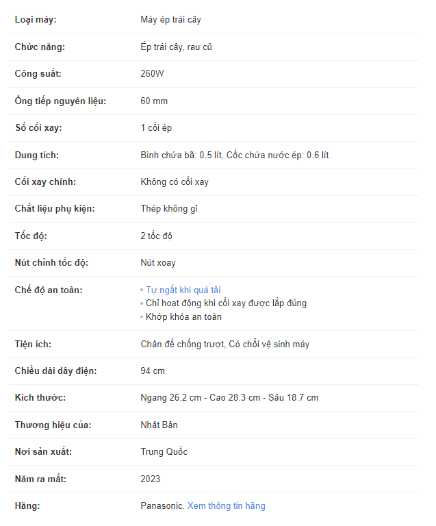 - Máy ép trái cây Panasonic hoạt động với mức công suất 260W giúp máy vận hành ổn định, ép trái cây và rau củ nhanh chóng.