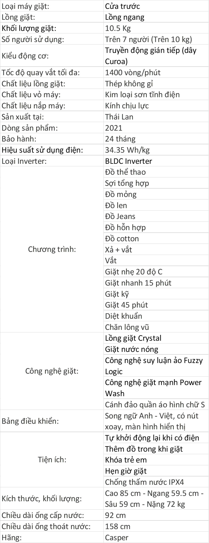 Với khối lượng giặt 10.5 kg là sự lựa chọn hoàn hảo với các gia đình trên 7 thành viên, nếu gia đình bạn nhiều thành viên hơn nhưng nhu cầu giặt giũ không cao thì máy giặt Casper 10.5 kg vẫn là sự lựa chọn phù hợp.