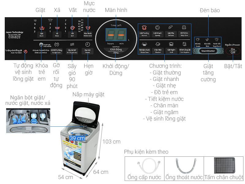 | Chế độ giặt: | 10 chương trình (có giặt thường, giặt nhanh, giặt tiết kiệm nước, giặt vải mỏng, giặt ngâm, giặt chăn mền, giặt đồ trẻ em, vệ sinh lồng giặt, sấy gió 90', chống xoắn rối) |