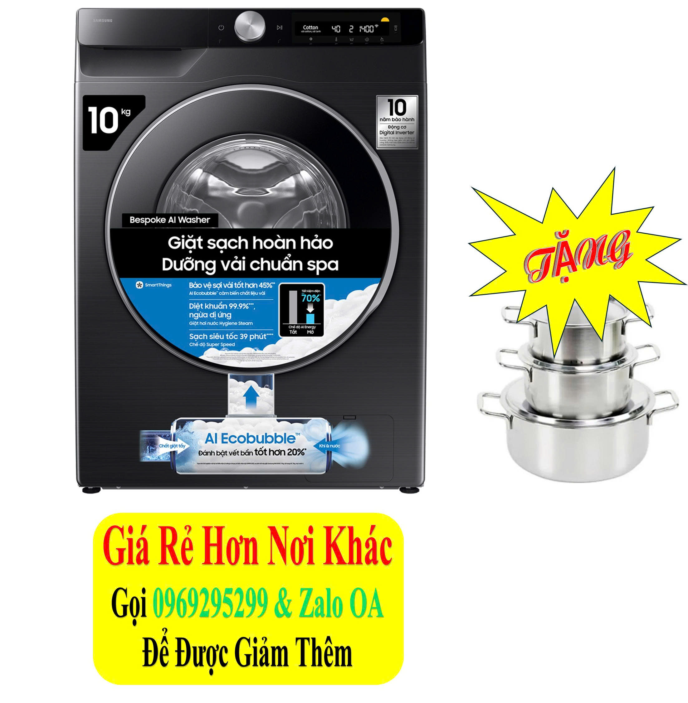 AI EcoBubble: công nghệ bong bóng siêu mịn giúp bột giặt tan nhanh gấp 40 lần, dễ dàng thấm sâu vào sợi vải. Máy còn tự động nhận diện chất liệu vải để điều chỉnh nhiệt độ và thời gian giặt phù hợp, đảm bảo sạch mà không làm hại vải.