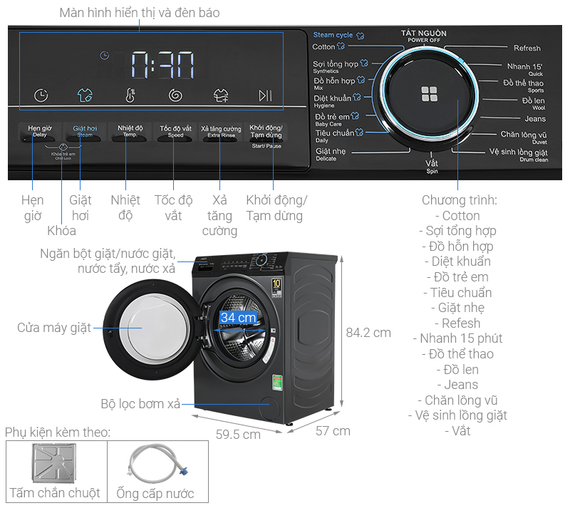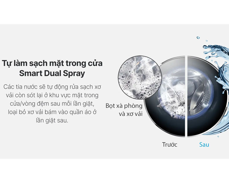 - Vệ sinh lồng giặt:Smart Dual Spray -Tự làm sạch mặt trong cửa và vòng đệm cửa