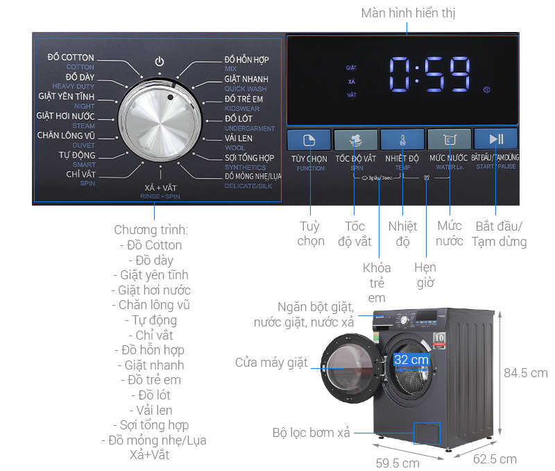 - Bảng điều khiển:Song ngữ Anh – Việt có núm xoay, nút nhấn và màn hình hiển thị