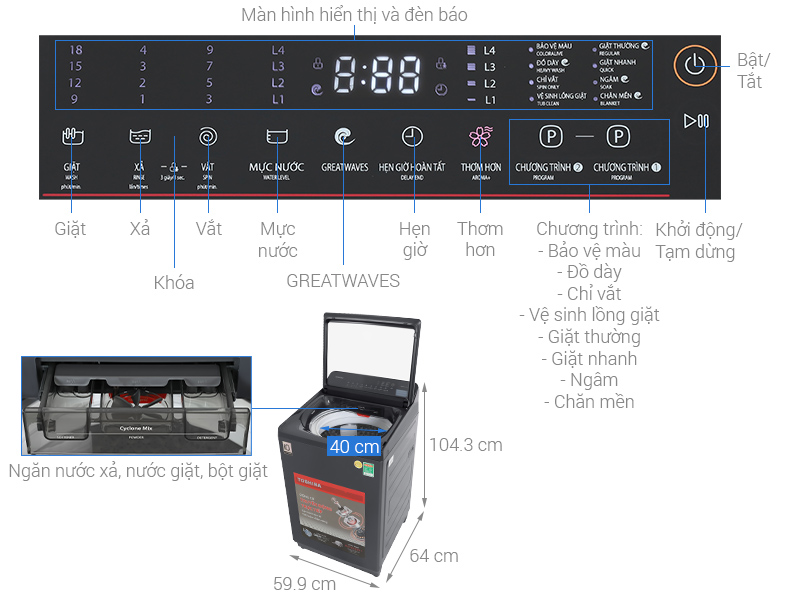 - Công nghệ GreatWaves giúp giặt sạch nhanh hơn
