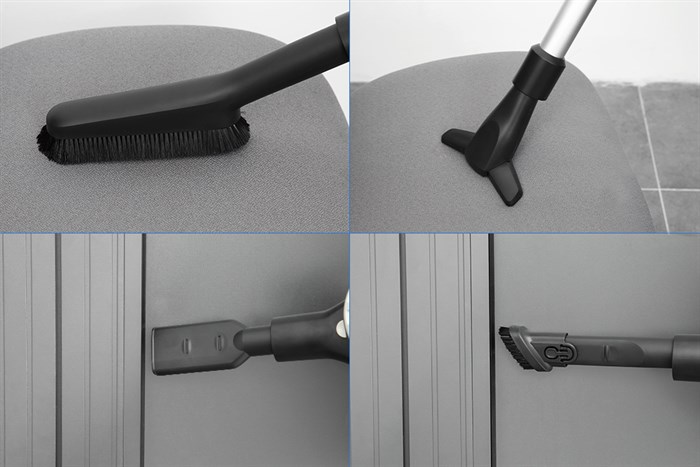 Sản phẩm đi kèm bộ phụ kiện 6 đầu hút đa dạng, bao gồm: đầu hút sàn, đầu hút bề mặt vải, đầu hút lông thú chuyên dụng, đầu hút linh hoạt với chổi quét bụi, đầu hút lông thú và đầu hút giường. Nhờ vậy, người dùng có thể dễ dàng làm sạch mọi ngóc ngách trong nhà từ sàn, thảm, sofa, gầm tủ, xe hơi đến các vị trí trên cao mà không gặp khó khăn.