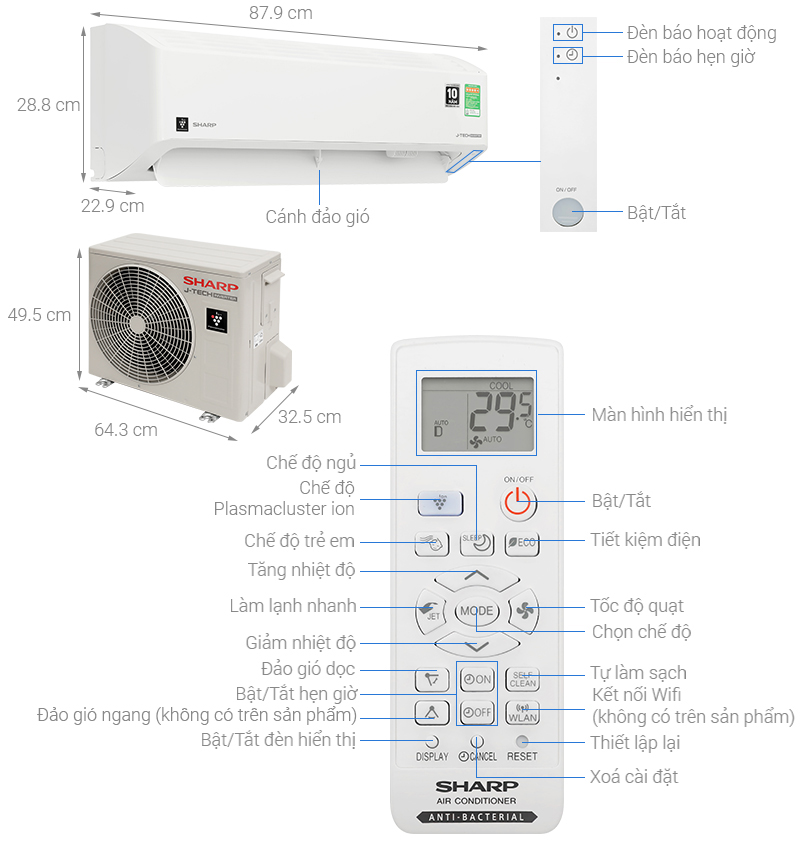 - Kích thước dàn lạnh:Rộng 87,9 cm × Sâu 22,9 cm × Cao 28,9 cm