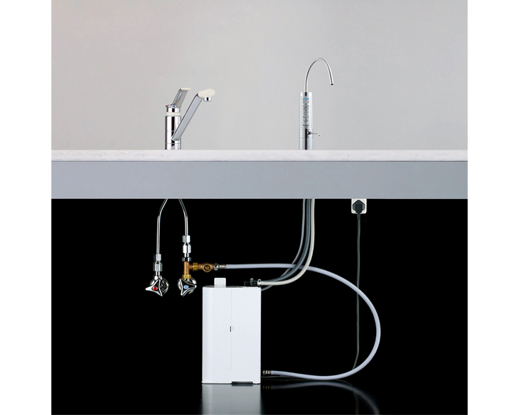 Phần vòi nước có thể gắn trên bồn rửa còn bình điện phân, bộ lọc lắp âm dưới kệ bếp thuận tiện.