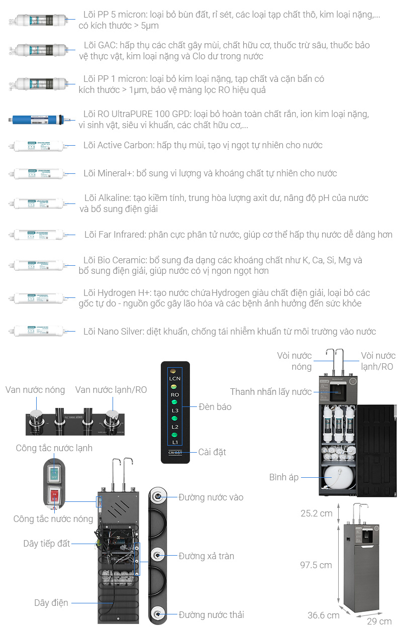 - Lõi diệt khuẩn Nano Silver: Diệt khuẩn trong nước và chống tái nhiễm khuẩn sau khi lọc.