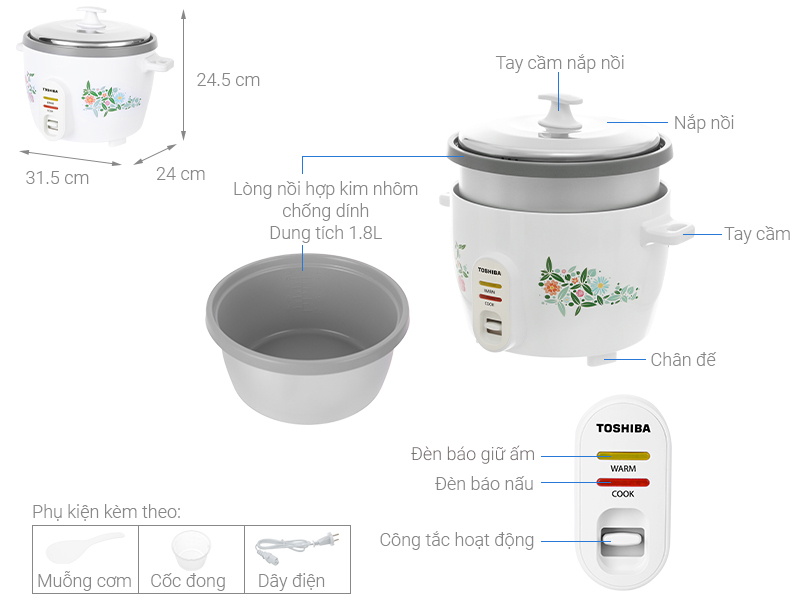Nồi cơm điện Toshiba kiểu dáng mềm mại, họa tiết trang nhã, thiết kế nắp rời với dung tích 1.8 lít dùng cho gia đình 4 - 6 thành viên