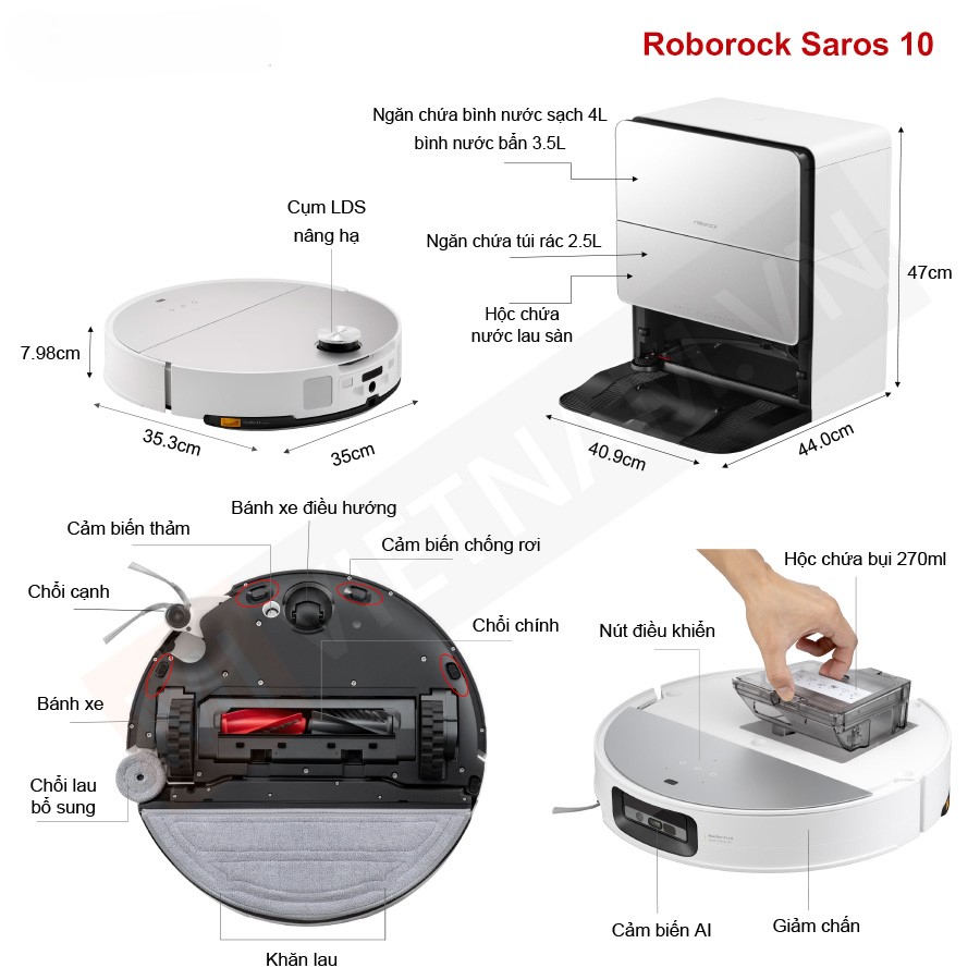 | Kích thước robot (khi ẩn cụm LDS) | 350 x 353 x 79.8 mm |