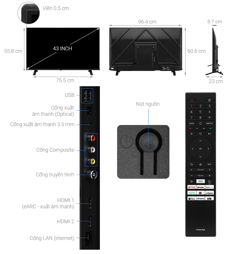 - Kích thước không chân đế:Ngang 96.4 cm – Cao 55.8 cm – Dày 8.7 cm