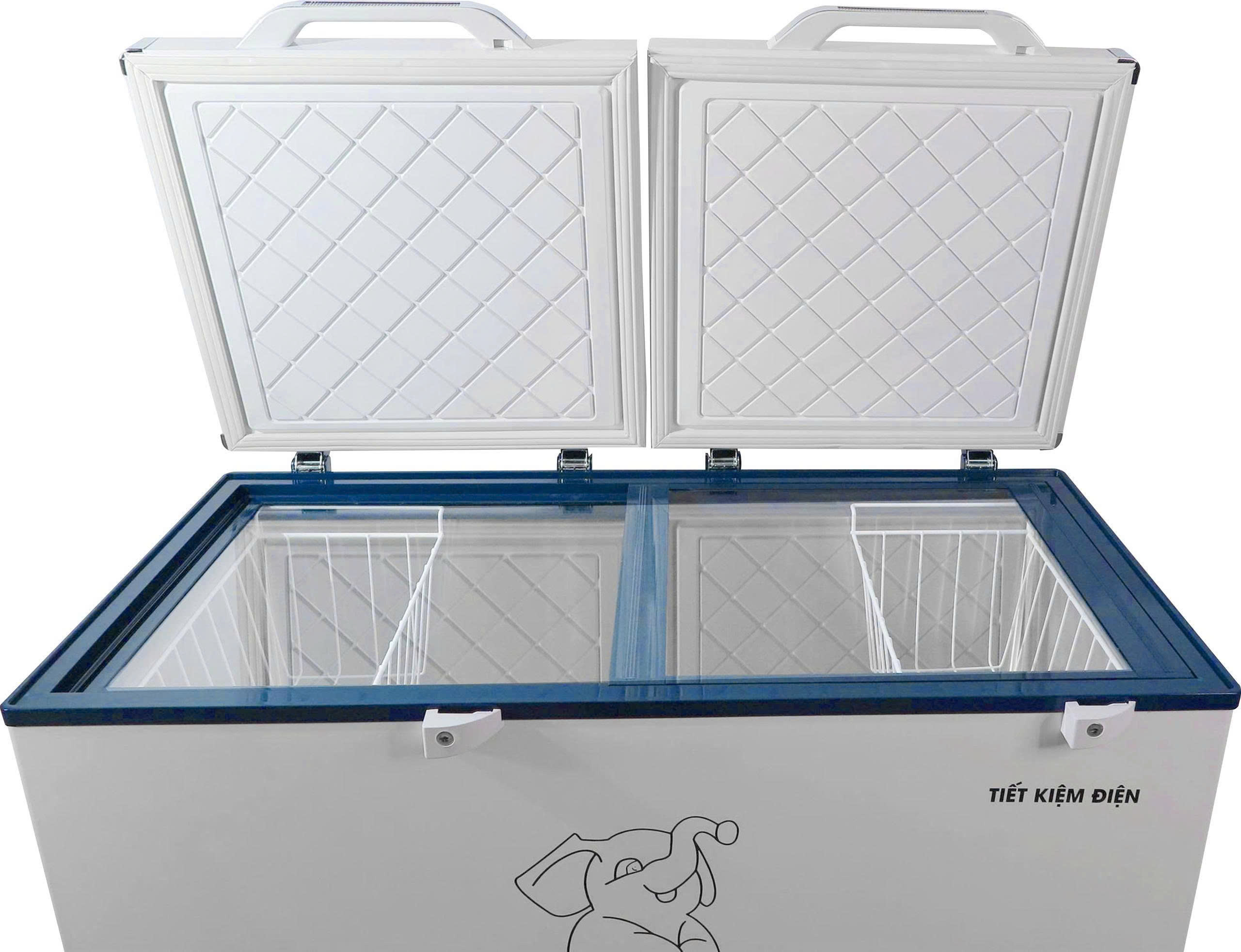 Tủ trang bị 2 cánh mở dạng vali bên trên, bên dưới còn có thêm cửa kính lùa 2 lớp sẽ giúp người dùng dễ dàng quan sát thực phẩm bên trong mà còn hạn chế thất thoát nhiệt, giữ cho tủ luôn hoạt động hiệu quả. Việc bảo trì, vệ sinh cửa kính cũng rất dễ dàng nhờ bề mặt kính mịn, sạch sẽ.
