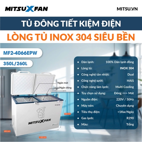 Tủ đông 2 ngăn MITSUXFAN MF2-4066EPW có dung tích tổng lên đến 350 lít, dung tích sử dụng là 260 lít sẽ mang lại không gian rộng rãi để lưu trữ nhiều loại thực phẩm. Tủ được thiết kế với hai ngăn tách biệt (1 đông và 1 mát), giúp bạn phân loại thực phẩm một cách khoa học và dễ dàng sử dụng.