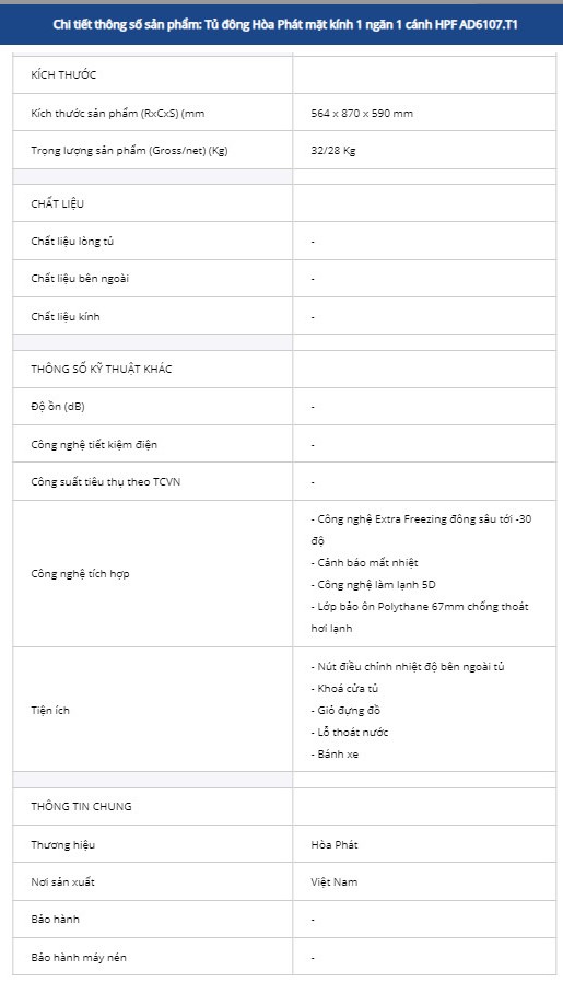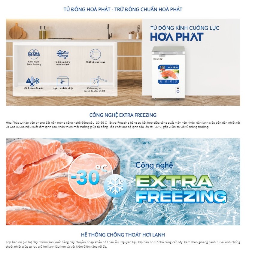Tủ đông Hòa Phát cánh kính 1 ngăn 1 cánh HPF AD6107.T1 sở hữu công nghệ Extra Freezing đông sâu tới -30 độ C, dàn máy nén khoẻ và hệ thống chống thoát hơi lạnh với lớp bảo ôn dày 62mm