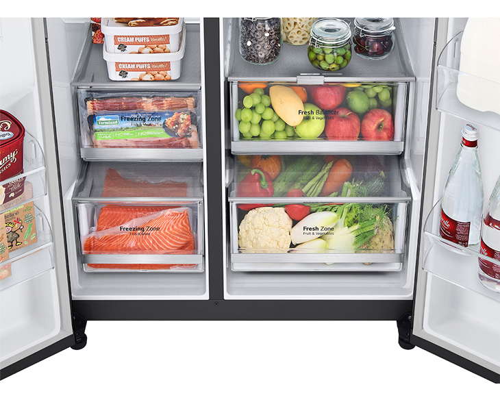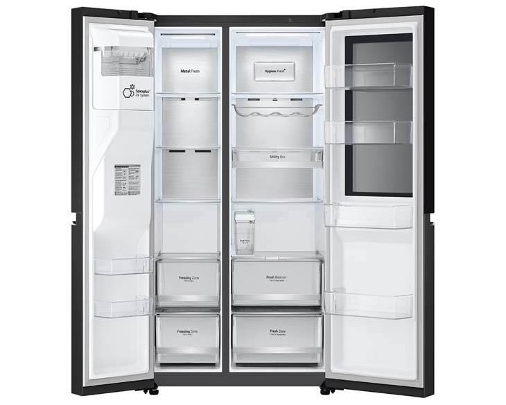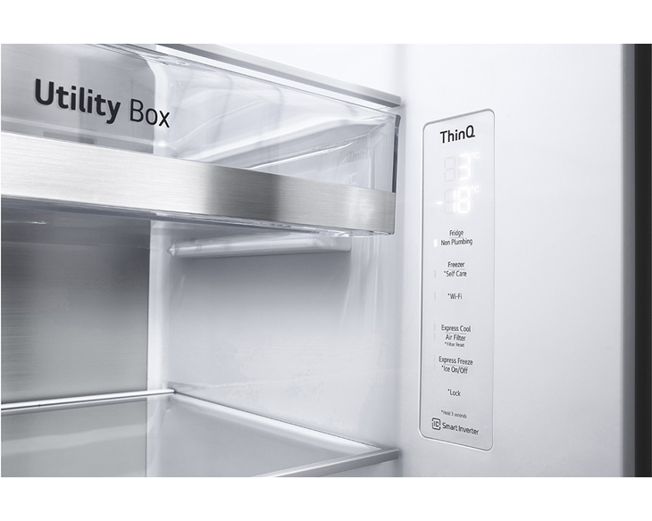 - Tiện ích khác:Dung tích lớn, lưu trữ nhiều hơn. Wifi ThinQ và Chuẩn đoán thông minh (Smart Diagnosis). Máy làm đá tự động (Spaceplus) làm đá viên, đá nghiền. Đông nhanh (Express Freeze). Thiết kế ống dẫn kim loại phẳng (Metal Fresh). Khóa trẻ em (Child lock). Cảnh báo